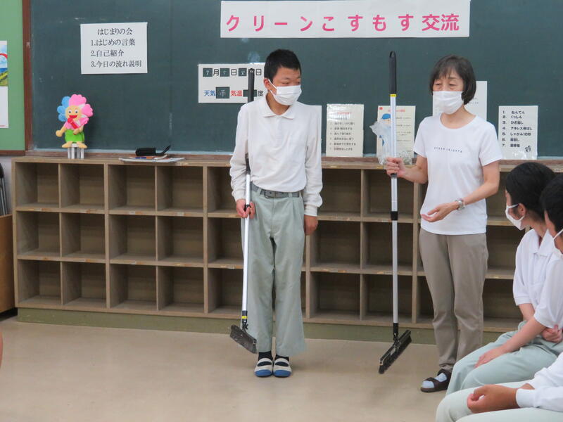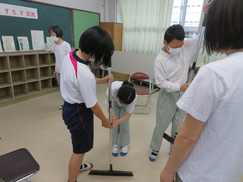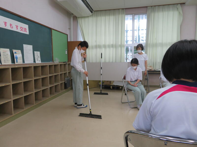 自在ぼうきの持ち方や使い方を高等部の皆さんが、まずは、デモンストレーションとしてやってみせて・・・その後は、マンツーマンで丁寧に教えてくれました。
