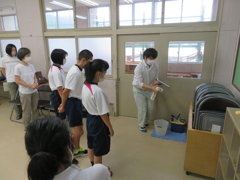 高等部キャンパスに中学部3年生3人がやってきて、清掃活動や作業学習を通した交流が行われました。
