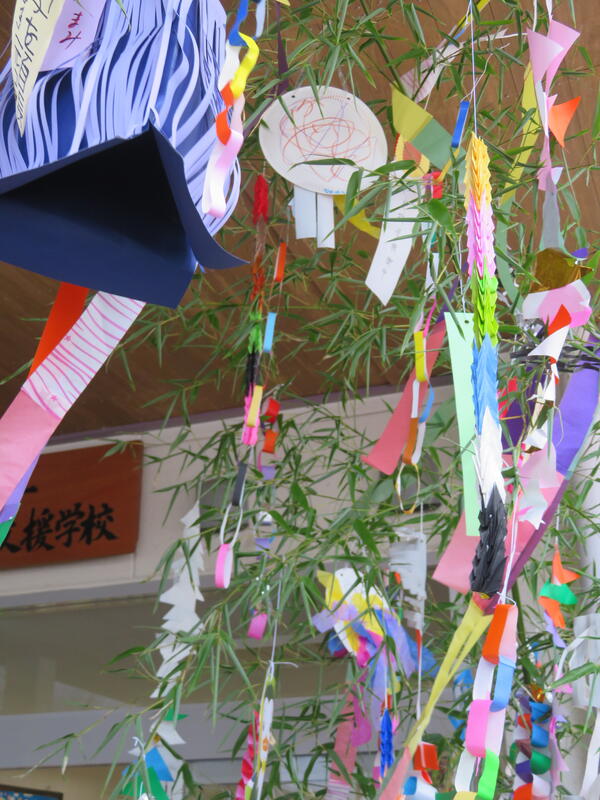 小学部56年生は、玄関に設置された竹笹に飾り付けをしました。