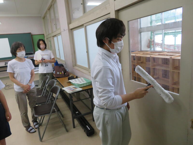 「作業学習」の朝礼から始まり、窓拭き・自在ぼうきの使い方の説明、そして、実際の作業実践・・・
