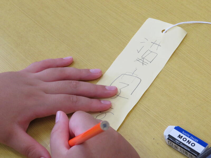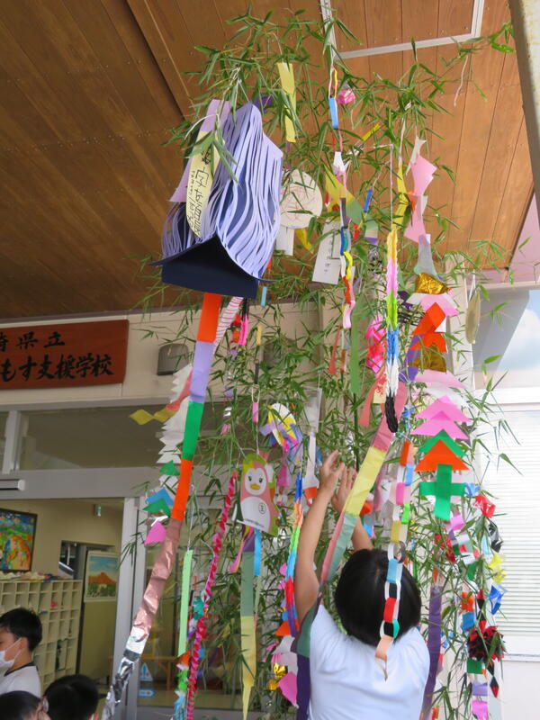 小学部56年生は、玄関に設置された竹笹に飾り付けをしました。