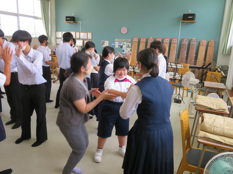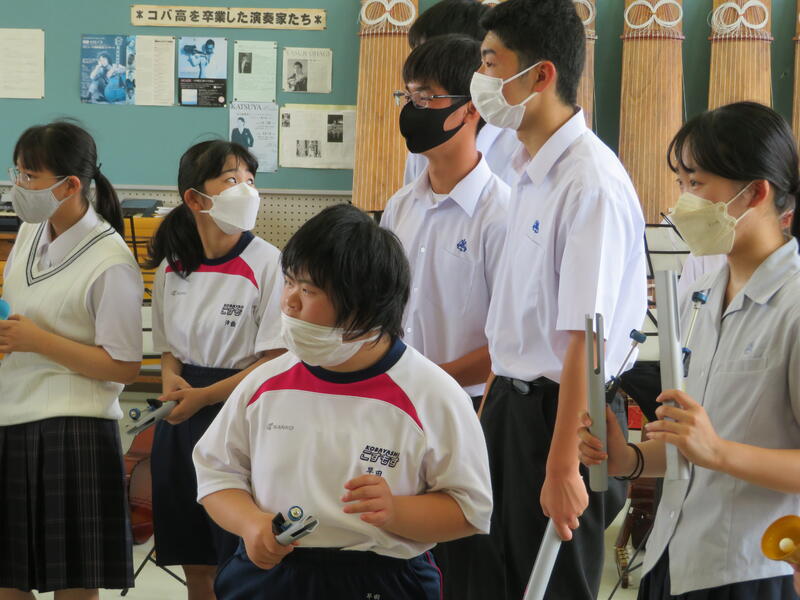 小林高校2年生の音楽選択生とこすもす支援学校の高等部生12人が、音楽の授業を通じて楽しい時間を過ごしました。