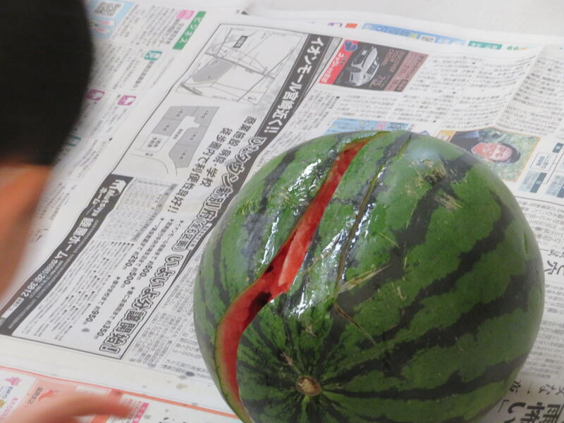 お昼の給食には、このスイカの一部がみんなに振る舞われました。