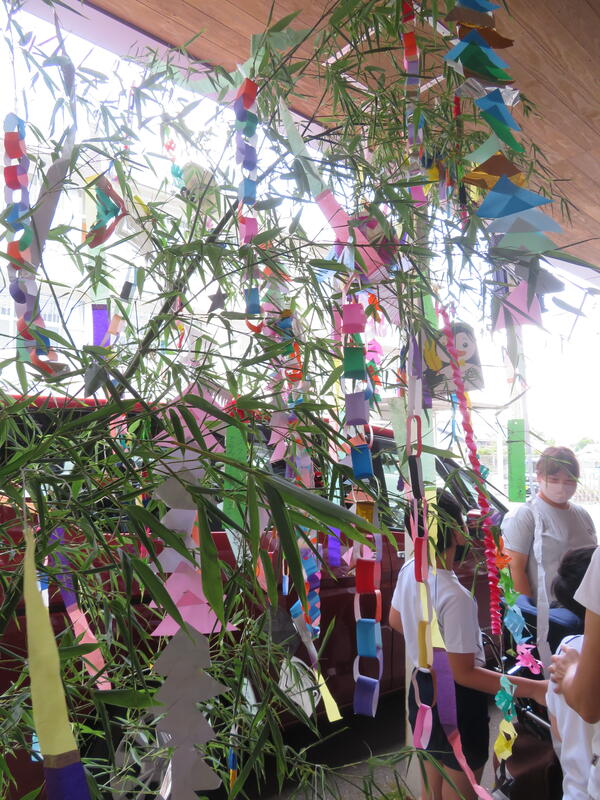 小学部56年生は、玄関に設置された竹笹に飾り付けをしました。