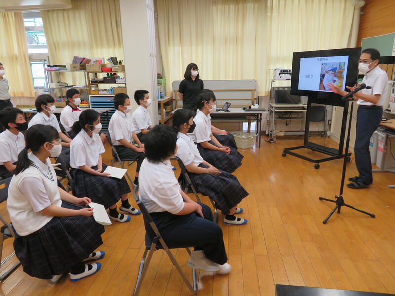MRT「みらい・みやざき まなび隊 」 のスタッフの方々が来られ、児童・生徒の皆さんは、ちょっとドキドキ・・・