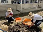 麦わら帽子をかぶり、畑の 整備をする2年生。冬野菜を植える準備をしています。