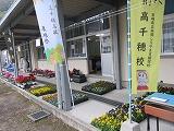 会場は高千穂高校の中庭です。正門には「農場祭」ののぼり旗が立てられ、地域の回覧板や町内放送でも案内が行われています。