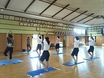 高千穂校の体育館に、マットを敷き、講師の先生のマネをしながらからだをひねったり、伸ばしたり・・・なかなかうまくいかず、「あー」「んー」「キャー」など悲鳴に近い声が聞こえてきました。日頃動かしていない部分を動かすので、とっても大変そうでした!! 自分のからだを意識しながら動かす事、とってもいい経験をすることができました。