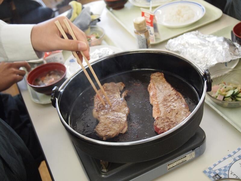 各テーブルで、交流が行われました。給食の献立は、なんと『ステーキ』!テーブルの上で焼いて食べました。とっても美味しかったです。おいしいステーキとみんなとのお話に夢中になり、給食時間があっという間に過ぎてしまいました。