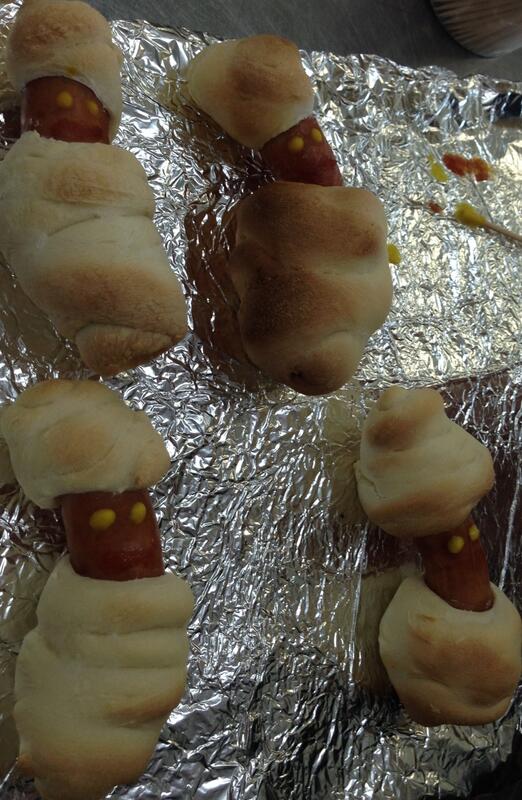 ウィンナーにパン生地を巻き付けてゾンビに見立てて作るハロウィンナーをみんなで作りました。