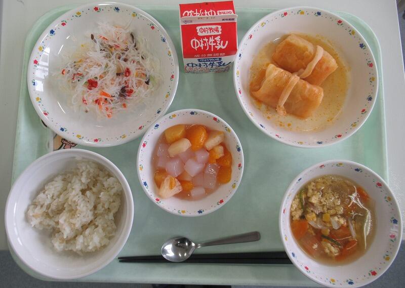 「麦ごはん」「牛乳」「春雨サラダ」「ロールキャベツ」「コーン卵スープ」「フルーツポンチ」