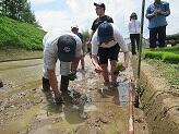 暑い日差しの中、膝上まで作業着をまくり上げ、ひんやりする田んぼの中に足を入れ一列ずつ丁寧に田植えをしていきました。足を田んぼの土に取られて、倒れそうになりながらも、和気あいあいと楽しそうでした。