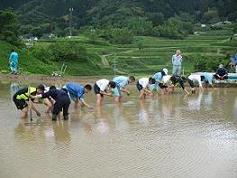 5月11日 水曜日 高千穂高校宮尾野農場において、高千穂高校生産流通科3年生の皆さんと田植え交流を行いました。前日に雨が降り、天候が心配でしたが、当日は、天候に恵まれた中で実施できました。