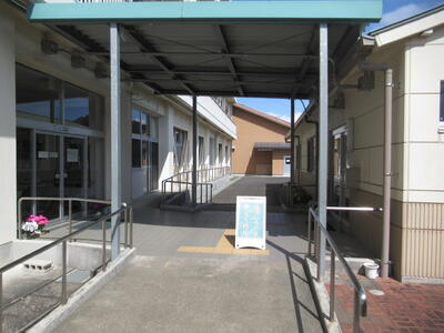 右側 植え込みの横にある建物が、しろやま高千穂 職員室・会議室です。