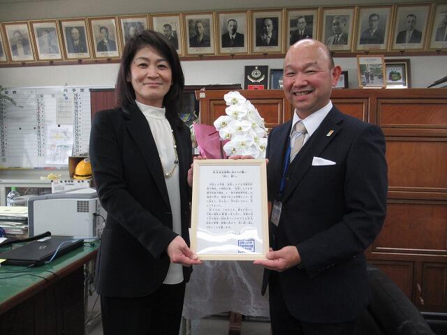 「共生社会実現に向けての誓い文書」を手に笑顔の、高千穂高等学校の校長先生(左)と延岡しろやま支援学校高千穂校の校長先生(右)