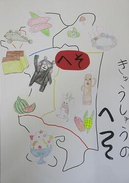 美術の時間に、「きゅうしゅう の へそ」の製品紹介ポスターをかきました