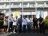 高千穂高校の快諾をいただき、なんと校門前の国旗・両校の校旗 掲揚台の前で行います!