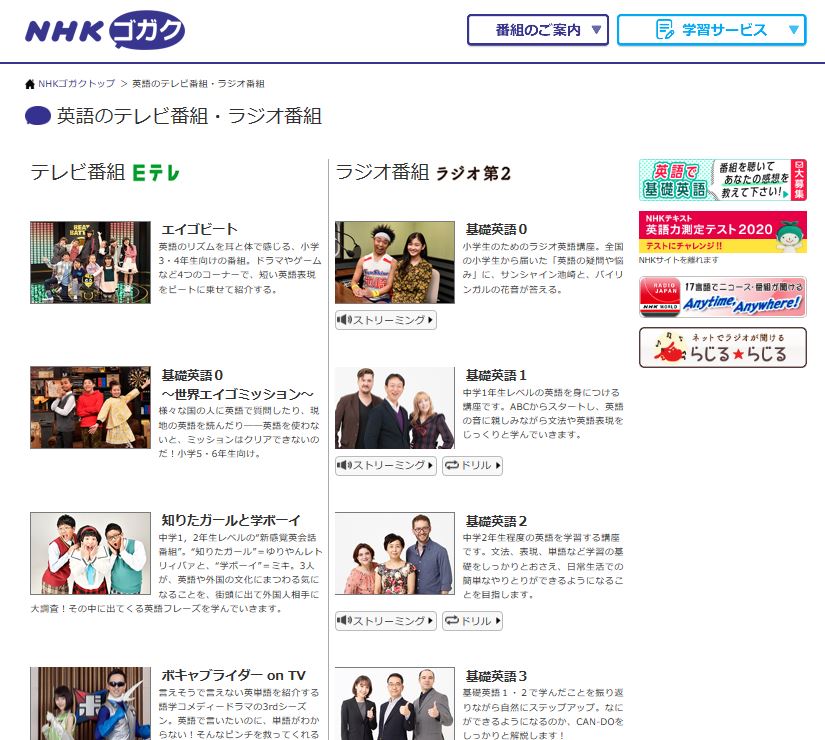 | ないよう | 英語のテレビ番組やラジオ番組が紹介されています。 |