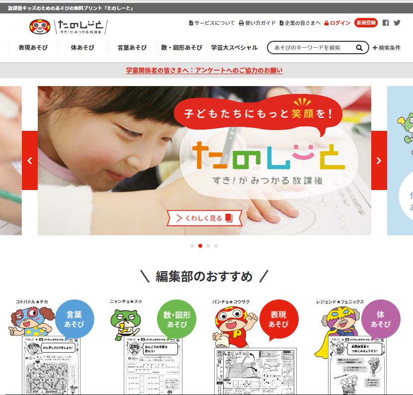| ないよう | 低学年むけのあそびのプリントです。大人ガイドがついて、すべて無料です。「あそびは最高の学び」をコンセプトに、工作から体あそび、言葉や数・図形まで、幅広いジャンルが揃っています。 |