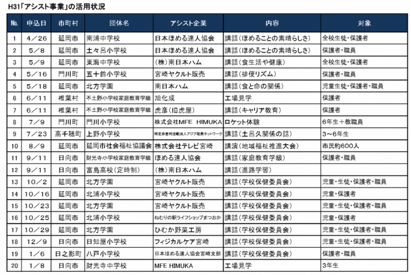宮崎県教育委員会では、専門性や人材など豊富な教育的資源を有する企業等と連携し、企業等が積極的に学校・家庭・地域の教育活動に参画できる環境を整備し、地域ぐるみの教育支援システムの普及・発展を図るために「アシスト事業」に取り組んでいます。