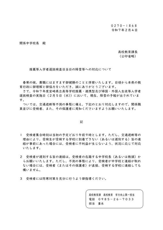 推薦等入学者選抜検査日当日の降雪等への対応について