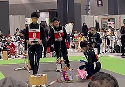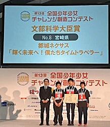 12月13日(土)、愛知県・国際展示場で行われた第13回全国少年少女チャレンジ創造コンテスト全国大会に、宮崎県代表・都城少年少女発明クラブ「都城ネクサス」(3名)のひとりとして、本校3年・長倉史拓さんが出場しました。大会には全国から40チームが参加し、それぞれ与えられた4分間の時間で、ロボット等のからくりの仕掛けを設置し、動かし、その内容についてプレゼンをし、撤収まで行う、という正確さも速さも技術力もパフォーマンス力も問われる競技です。長倉さんのチームは、8番目に「輝く未来へ!僕たちタイムトラベラー」というテーマを提示して競技を行い、練習どおりノーミスで4分間を十分に使い切りました。午前20チーム、午後20チームの発表が終わり、いよいよ結果発表。長倉さんのチーム・都城発明クラブ「都城ネクサス」は、第1位の文部科学大臣賞を受賞しました!おめでとうございます。
