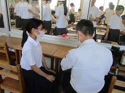 朝から髪型を気にしている人がなぜか多い3年生。実は11月4日(火)4時間目に「卒業アルバム個人写真撮影」が行われるからでした。4時間目、下足室前に集合した3年生。カメラマンの方の指示に従って、出席番号順に合服にそろえて写真を撮っていきました。「笑顔で!」というリクエストにさわやかに答えられる人のなんと多いこと!さあ、どんなアルバム写真が出来上がるか、楽しみです。