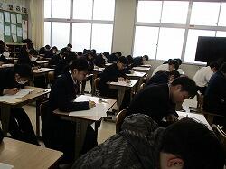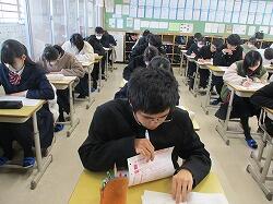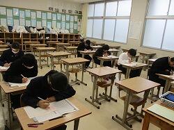 本校は、「学力推移調査」を年に2回受けています(1年生は1月の1回のみ)。「学力推移調査」とは、全国の中高一貫校を対象に行われる学力調査で、教科は国語・数学・英語の3教科、それに学習状況調査も行われます。毎回、分量や内容共に充実した手応えのある問題となっています。現在の自分の学力を量り、高校へとつなげていくために、どんな点が力がついていて、どんな点を復習しておくべきか、今後に活かせる調査です。GTZ(学力到達ゾーン)という指標も示されますので、そういった点も中高一貫校ならでは。本年度の2回目(1年生は1回目)の学力推移調査は1月23日(火)~25日(木)の1時間目に行われます。1教科45分ですが、3年生の2回目は1教科60分となっています。初日の生徒たち、いずれも集中して真剣に調査に臨んでいました。