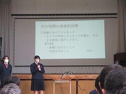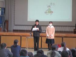 先週行われた学級討議・四者会・中央清泉会を経て、1月25日(木)7時間目に清泉会集会が開かれました。今年度開かれる集会も残り少なくなってきました。日常の取組としては今年度最後となる旬間が始まります。旬間の目標達成を目指し、各委員長から発表された具体的対策に全員で主体的に取り組んでいきたいものです。また、今回の集会では、3学期に行われる「立志式」「卒業式」などを見据えて、挨拶や礼などをしっかりできるように、みんなで練習しました。保体清泉会の保健委員を代表して3年の宮原瑛太さんと松葉理桜さんからは、3月8日(金)に実施予定の「お弁当の日」についてのお知らせや紹介がありました。集会後に表彰・紹介も行われました。今回表彰・紹介されたのは以下のとおりです。