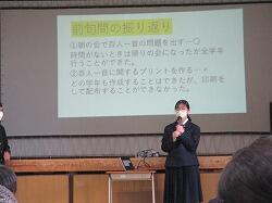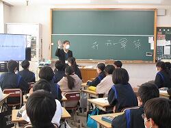 国語で学習すべき事項はほぼ終わっている3年生。そこで、3学期全班は、3年間の国語の学習の振り返りということで、五つの文章から複数を選び、それを比較しながら、テーマを決めて学級全体に授業をして、言いたいことを伝える、という学習を進めてきました。準備の時間は実質2時間でしたが、その間4人の班のメンバーで、テーマを決め、授業用のプレゼンを作り、授業の担当を決め、実践できるまでに作り上げることができました。1月31日(水)3時間目には三つの班の授業が行われました。どの班も、この3年間で培ってきたさまざまなことを取り入れていました。例えば「言葉」のもつ意味にこだわる、最後に一般化・抽象化を図る、既習の文章で学んだ内容を取り入れて深める、授業の途中で受けている生徒に互いに話し合わせる、等々。授業を聞きながら、こんな視点もあったのか、とか、上手なまとめだな、とか、驚かされたり感心したりする場面ばかりでした。残り7班の授業がますます楽しみです。