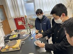 令和6年1月26日(金)の放課後、化学部の先輩方に実験を教えていただきました。今回は準備からサイエンス部員が活躍できる場を用意してくれていたので、みんな熱心に実験に取り組むことができました。テルミット反応という酸化還元反応の実験でした。燃焼する際の様子が面白いから、附属中生が興味をもってくれるのではないかと考えてくれていたようです。その意気込みを聞けただけでも、附属中生は感動していました。酸化鉄5gとアルミニウム2gを部長の附属中出身である大山先輩の手助けを借りながら、田中さんが丁寧に測りました。次に、重留さんが乳鉢で丁寧に混合し、長倉さんが、附属中出身の永野先輩と一緒にマグネシウムリボンを切りました。1回目の実験は思ったほど火の手があがらず、「なぜ?」かを検証したところ、濾紙を濡らしていないことが判明。すぐに、再挑戦。失敗を次の成功へと導くために考えるところが附属中生のいいところです。次は3000度の高温になり、酸化鉄を取り出すことがでるはずでしたが、取り出した小さな塊をハンマーでたたくと、粉々になってしまいました。残念ながら酸化鉄は取り出せませんでしたが、様々な反応が見られ、とても面白かったです。・・・結果、バケツに穴が開くということも驚きでした。実験後は、恒松さんが、「マグネシウムリボンを使った理由」を質問したり、とても有意義な時間となりました。ご協力いただいた、化学部のみなさん、鳥取先生、ありがとうございました。