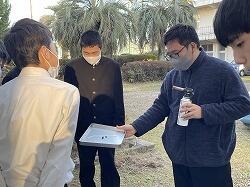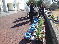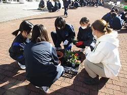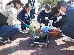 冬の澄んだ冷たい空気を纏い冴え冴えと輝いた夕べの満月の名残の残る空を見上げた1月26日(金)早朝。中学時代に感染症による行事への影響を受けた学年の一つである高校2年生が修学旅行に出発しました。同時に、この日は1年生の福祉体験学習の最後となる「花の移植体験学習」も行われるとあり、天気がよいことと、寒すぎないことを祈りつつの見送りとなりました。5・6時間目に行われた「花の移植体験学習」は、今年で4回目の実施となる福祉体験学習です。1年生はさまざまな福祉体験学習を重ねてきました。そして10月にその集大成として高齢者施設を訪問し学習させて頂きました。今回行ったのは、お世話になったそれぞれの施設の方々に心を込めて花の寄せ植えを贈ろう、という取組です。講師として来ていただいたのは、南九州大学環境園芸学科の長江嗣朗先生、そして南九州大学の3年生・4年生の8名の学生の方々にも指導の協力を仰ぎました。5時間目は長江先生の授業。「花と人との関わり~花はヒトに必要か~」と題された先生の授業は、表情豊かに軽妙な語り口で生徒たちの心をぐんと掴んでいくのが伝わってきます。生徒たちも先生が仕掛けられた問いに答えようと一生懸命です。「なぜ高齢者施設に花を贈るの?」ということを花の不思議や花の来歴などをひもときながら考える場を与えてくださいました。続く6時間目は、寄せ植えづくりの実習です。実習に向けて、大学生の方々が5時間目のうちに外で準備をしてくださっていました。大学生の方々は、それぞれの班についてくださって、寄せ植えについて細かに指導して頂きながら楽しく実習に取り組みました。あちらこちらで大学生の方々と生徒たちの笑顔や笑い声が溢れ、心のこもったよい寄せ植えを作り上げることができました。後片付けも済んだ後、生徒を代表して井之上さくらさんがお礼の言葉を述べました。お忙しい中、多くの準備をしてくださり、手厚い指導をしていただいた、長江先生、大学生の方々、そして派遣くださった南九州大学に深く御礼申し上げます。ありがとうございました。寄せ植えは、近々各高齢者施設に届ける予定です。