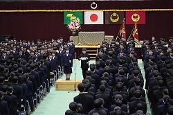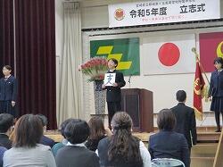 教室では担任・副担任の先生が待っています。1年生は入場の仕方や入学式の流れ、その後の活動等の説明を受け、体育館前に移動して待機。「新入生入場」の声と吹奏楽部の演奏にのって中学1年生を先頭に入場し、会場は一斉に拍手。いよいよ第15回入学式が、高校第79回入学式と共に始まりました。呼名点呼では、担任の先生の呼名に対し、どの生徒も元気よく返事をし、起立していきました。校長先生が中学生40名、高校生284名の入学の許可をされ、計324名がはれて泉ヶ丘の一員となりました。校長先生の式辞。125年の歴史と伝統のある泉ヶ丘で、今年の入学生はSSH(スーパーサイエンスハイスクール)1期生という新たな歴史を刻む生徒たちとなること。キーワードは「探究心」と「レジリエンス」。さまざまな体験を五感で捉え、培った知識や技能を応用し、しなやかに折れない心で未来に向けてひるむことなく挑んでいってほしいこと。そしてそれは「見えないけれどいくつもの優しい手」が添えられてきてできたことで、これからもその手が支えてくれていることに感謝の気持ちを忘れず、今度は自分自身が誰かを支え誰かを思いやる「優しい手」の持ち主、真の大人になろうということ。最後に、校内からいつも生徒を見守っている二つの木を紹介され、冬でも花を咲かせる梅の木のように困難に負けず強い意思をもち学問に挑む(レジリエンス)心をもち、長い年月をかけて生長していく楠の木のように、生涯にわたって学び続けていく(探究心)姿勢で毎日を充実させ未来を切り開く人として成長してほしいと結ばれました。新入生代表宣誓では、中学生代表の築地咲樹さんが高校生代表と一緒に息を合わせて堂々と宣誓しました。入学式を終えて、次は対面式です。新入生と在校生が向き合って、生徒会長が歓迎の言葉を、中学生代表の久保瑛尊さんと高校生代表が、それぞれ挨拶を述べました。久保さんは自分の今の気持ちやこれからの学びへの思い、先輩方への言葉などしっかりした言葉で発表しました。