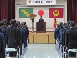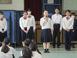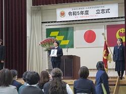 中学生は場所を移動して中学生集会を開き、改めて新任の先生のお話を聞き、歓迎の拍手でお迎えしました。続いて新学期の抱負を、2年生代表・黒木颯斗さん、3年生代表・下沖由依さんが発表しました。それぞれ今までの自分を振り返り、どう変えていくか、どう挑戦していくかをしっかりと前を見つめて述べました。教頭先生からは「夢中になろう」と自分が本当に好きで夢中になって取り組むことを追い求めていくすばらしさを話していただきました。生徒支援部の先生は、「いのちを大切に 心身共に健康に 周りを思いやる」といった基礎・土台の上に、主体的に挑戦してほしいということ、学習担当の先生は、「未来を拓く探究心とレジリエンス」を育むために授業や課題についてどう取り組み改善していくかということを話してくださいました。