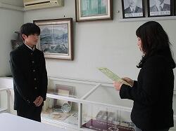 3年生満永由師さんが書いた税の作文「おじいちゃんの補助金」が南九州税理士会長賞を受賞しました。今日は、シティエフエム都城(FM76.4MHz)から放送収録に来ていただきました。本人が朗読した作文が、今週2月3日(土)午前11時からの放送で紹介されます。