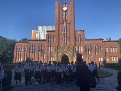 5月14日(火)、東京、羽田空港に降り立った修学旅行中の3年生40名。最初の訪問は東京大学です。正門前に到着すると、担当をしてくださった、小川さまと横田さまが待っていてくださいました。東大の学食で様々なメニューでお腹を満たした後、いよいよ授業です。「海の再生可能エネルギー」と題された鈴木英之先生の授業では、未来のエネルギーの可能性を知り、新たな知識を知ることができました。また、船型試験水槽棟では、実際に曳引機に乗せていただいたり、模型などを見せていただき体験を通して学ぶことができました。最後に安田講堂や赤門前で写真を撮って東大を後にしました。
