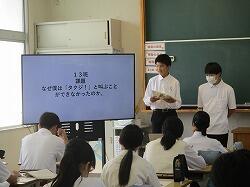 2年生は国語の文学的文章の学習で、年間通して「人物像をとらえる」学習に取り組んでいます。今年度から新しく入った教材「ヒューマノイド」(伊坂幸太郎・光村図書)で、自分たちがたてた課題を解き、それを発表し、そこから人物像を個人でまとめる、という学習に取り組みました。10月1日(水)から2時間ほど、たてた課題を班ごとに文章から根拠を見つけ解決し、それを発表しました。中にはとてもユニークな課題もありました。なるほど、と思わせるような深い読みをする班もありました。読む力・発表する力など、授業を通してさまざまな力を身につけて行っています。