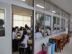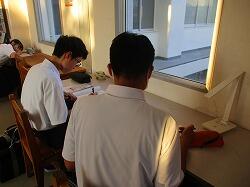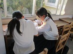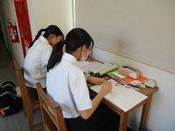 毎日週間天気予報を気にしていたこの1週間。「10月18日(土)、雨が降りませんように……。」との思いから。果たして、少し泣きそうな空にはなりましたが、何とかほとんど雨粒がおちないうちに第2回学校説明会を実施することができました。前日までも、各学年、リハーサルや準備に一生懸命取り組んでいました。そして当日。午前中の1年生のメイン会場となる義友会館の設営から学校説明会の準備がスタートしました。実は1年生は第1回でも設営してくれていて、大変手早くスムーズに会場づくりを行いました。受付、ステージ、椅子並べ、清掃と一生懸命頑張りました。3学年とも4時間目の時間帯に早めの昼食を摂り、午後からのリハーサルと分科会場設営に取り掛かりました。10の教室に分かれた分科会場では、3年生・2年生が協力して清掃や会場づくり、リハーサルを行いました。手早く、目配り、気配りをしながらしっかりと準備していました。3年生は、都泉祭で作った展示を小学生の皆さんや保護者の方々に見ていただこうと、楽しそうに1階ロビーに展示していました。