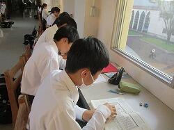 令和7年10月20日(月)の⑦限目に、異学年学習交流を行いました。学習清泉会が中心となって、全体に声掛けし、異学年交流学習が実現しています。教科ごとに分かれて、明日からの定期テストに向けて生徒たちは学習を進めていました。不得意教科の確認学習だったり、やらなけれならない学習の追い込みなど、それぞれが目標をもって取り組めていたようです。また、数学オリンピックに申し込んだ生徒は、数学オリンピックの過去問に挑戦しており、自走学習に向けての弾みにもなったと思います。先輩後輩への質問なども積極的に行っており、ほほえましい場面も見られましたよ。附中生、明日からのテストに全集中!!
