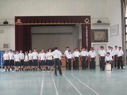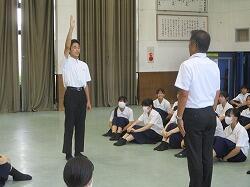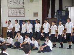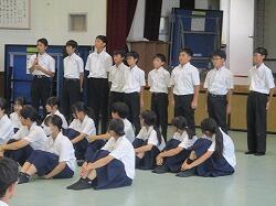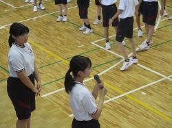 9月19日(木)7時間目に、地区中学校秋季体育大会に向けての壮行式が義友会館で行われました。2年生・1年生中心となった新チームでの初の中体連主催の大会となります。式では激励の言葉を清泉会会長の3年・平山笑里さんが述べました。次いで女子バドミントン部、女子バスケットボール部、男子バスケットボール部の順に、前に整列した選手が全員起立し、各キャプテン(安藤結貴さん・内田陽菜さん・大渡健慈さん)が決意の言葉を述べました(陸上競技に出場する齋藤誠志朗さんは教室で述べました)。そして、男子バスケットボールキャプテンの2年生・大渡健慈さんが堂々と決意を宣誓しました。教頭先生からは「ミスや失敗を恐れず挑戦してほしい」というお話がありました。さあ、いよいよ大会です。本校では23日(月)に開始される男女バスケットボール部が最初に大会に挑んでいくことになります。