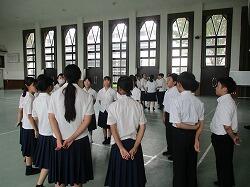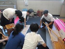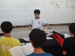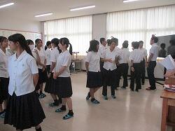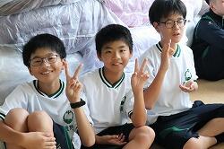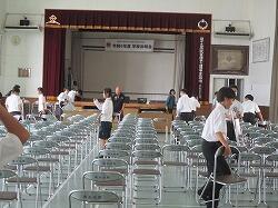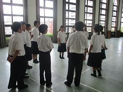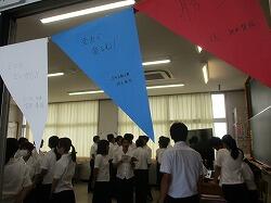 速度を遅くし、予想よりもずいぶん九州に近づいてきた台風のため、泉ヶ丘では日程の変更等が行われています。また、8月27日(火)は、朝は晴れていたけれど、途中から雨と日差しが混じる台風接近を感じさせる天気となりました。この日、附属中では朝から中学体育が行われ、主に中学生アトラクションであるダンスの練習を一生懸命行いました。振り付けを覚えつつ、フォーメーションの指示も出て、ダンスの全体像が把握できるようになりつつあります。ダンス実行委員を中心に3年生がよく頑張っています。午前中後半は、文化の部の準備です。3年生が合唱の練習をするというので音楽室にあがってみると「JAI HO!」(ジャイホー)という難曲に挑み、少しずつ成長の階段を上っていました。職員室前に来ると、2年生数名がパソコンを覗き込みながら合議したり笑ったりしています。どうやらCM作りの一端を垣間見たようです。総合教室前を通ると、今度は1年生が数名、白い布を前に集中して頑張っています。学級旗つくりにいそしんでいました。技術室や教室では合唱や展示物つくりをそれぞれ行っていました。再度音楽室に上がると、今度は2年生が合唱の練習をしていました。1年生のころからずいぶん成長して男女とも大人の声に近づいてきています。仕上がりが楽しみです。午後は、文化の部の準備と団活動が行われていました。雨模様だったため、雨天計画で、団ごとに時間や場所を変えて、高校3年生のリーダーたちを中心に、アトラクションや応援の準備・練習をしていました。台風接近により、準備に多くの時間が割けない状況も生まれてきています。それも見越して、みんな頑張っていました。
