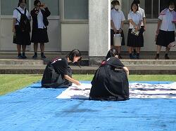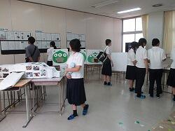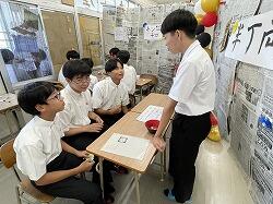 すばらしい天候に恵まれ、9月1日(日)、本年度の都泉祭(学校祭)が、本校を舞台とする「学校の部」から始まりました。8時30分から開会の部がオンラインでおこなわれ、中学生の発表・展示の紹介は、3年の石窪大和さんが、1年生の部から3年生の部までをまとめてコンパクトに紹介しました。初めて開会式がオンラインで行われ、動画等もあり、時間は押しましたが充実した内容でした。1年生は9時5分開始で自然科学探究の発表となっていたため、開始がやや遅れてしまいましたが、それぞれが1学期からテーマを決めて研究してきた内容を、上手にプレゼンテーションにまとめ発表していました。半年前まで小学生だったとは思えない立派な姿でした。会場も、さまざまなポスターや飾り付けで明るい雰囲気で、それぞれが書いたレポートも展示されていました。2年生は、6月末に行った職場体験学習を、それぞれ新聞と共にプレゼンテーションにもまとめていて、どのような体験学習であったのか、分かりやすく説明していました。2年生は、伺った職場の方にも今回の発表について案内しており、何軒か、職場の方もご覧になってくださいました。ありがとうございました。会場も、さまざまな道具を使って、楽しく見やすくレイアウトされていました。3年生は、5月に行った東京方面の修学旅行について、印象に残ったものをモチーフに模型を作ったり、みんなが楽しめるような遊び場を作ったりして、楽しく紹介していました。台風の影響で予定通りに進まず、ギリギリまで苦労してつくりあげた力作となりました。中庭では9時過ぎから書道部の書道パフォーマンスが行われ、大きな大きな紙に、書道部みんなで文字と絵を構成した作品を協力してつくりあげていました。中学生も、3年・石橋彩花さん、2年・井上結月さん、瓦田佳子さんが、りりしい袴姿で頑張っていました。10時から体育館で行われたビブリオバトルには、2年生・待木玲香さんが中学生として唯一参加し、発表しました。昨年度に続き、高校生に混じり頑張っていました。続けて体育館で行われたいずみArtist Stageでは、2年生・飯山結月さん、久野優さん、萬壽瑛那さんがバンドを組んで参加し、かっこいい演奏と爽やかな歌声を披露しました。義友会館には美術部の作品、書道部の作品が展示され、組紐体験などに中学生が積極的に参加していました。また、美術室では中学生の美術部員もレジンチャームや缶バッヂづくりを来場者に教えていました。屋台の食品を扱う場所でも、係活動で中学生も活躍していました。お昼近くになると、屋台の前は大行列。好天の下、外で三々五々食事をしたり、かき氷を頬張ったり、楽しそうに過ごす中学生たち。どの生徒にとっても、楽しい充実した1日となったのではないでしょうか。