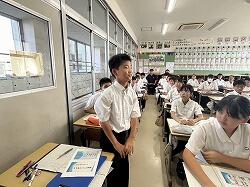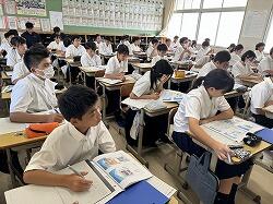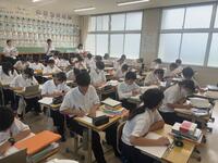 9月18日(水)2校時に支援訪問授業が行われました。1年生の国語の授業で「表現を工夫して気持ちを表そう〜星の花が降るころに〜」という単元です。単元の最後の学習ということで、前時までに学んできた「気になる表現」の共通点から学んだことを、自分自身の表現に活かして言語活動を行いました。個人で活動した後、班で話し合い、発表し、まとめる、という流れで、みんな真剣に取り組んでいました。ノート記録とタブレットの活用を、生徒たちはバランスよく行っていました。この日は、県教育委員会の2名の先生以外にも、教科に関わらず本校の中学・高校の先生方や教育実習の先生も参観していました。こうして生徒と同じように先生方もよりよい授業づくりに邁進しています。これから、12月にかけて支援訪問授業が順次行われていく予定です。