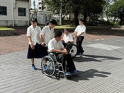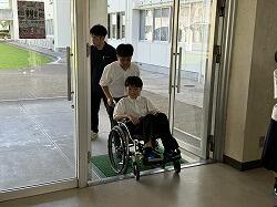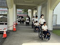 1年生の総合的な学習の時間は、9月~10月にかけて福祉教育体験活動が数多く実施されます。これはキャリア探究の中の福祉分野の学習で、1年生は高齢の方や障がいのある方ついて体験を通して学びます。9月18日(水)6・7時間目に、1年生は車椅子を実際に体験し、講話では福祉についてお話を聴きました。この日、講師としておいでくださったのはウエルライフの方々と、都城社会福祉協議会の川﨑様です。最初に、ふたグループに分かれて車椅子体験です。それぞれ二人組になり、車椅子に乗る人、車椅子を押す人を順に体験しました。段差があるところや、坂になっているところなど、工夫が必要です。体験を通して学ぶことがたくさんありました。後半は福祉講話です。「『ふくし』って何だろう」ということを考えることから入り、福祉のさまざまな分野のこと、身のまわりにはいろいろな人がいること、そしてそれらすべての人が安心して幸せな毎日を送れるようにしていくことが大切なこと……。これから先、福祉の学習を重ねていくその始まりとして充実したお話を聴くことができました。最後に生徒を代表して、北村隼人さんと首髙友肖さんがお礼の言葉を述べました。講師として来校くださった全ての方々、そしてご協力いただいた都城社会福祉協議会に厚くお礼申し上げます。ありがとうございました。