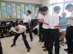 10月8日(火)4・5校時に、1年生は福祉教育体験活動の一環として、「高齢者擬似体験講座」に臨みました。講師としておいでくださったのは、都城医療センター附属看護学校の3名の先生方です。体育着・ジャージに着替えた1年生は義友会館に集合整列。講座は、「高齢者とはどんな特徴があるのだろう」「高齢者はどんな生活をしているのだろう」ということをイメージするところから始まりました。そして、四つのグループに分かれて、それぞれ体に重りをつけ、手袋をつけ、ゴーグルをかけ、高齢者の擬似体験を順に行っていきます。その状態で、階段を上り下りしたり、布団を上げ下ろししたり、ペットボトルなどをあけたり、新聞を読んだり、箸でものを掴んだりするのですが、あちらこちらから「うまく歩けない」「動きにくい」「よく見えない」などの声が上がります。また、擬似体験をしている本人だけではなく、周りのサポートもとても大切になってきます。実際に体験したり、サポートしたりすることを通して、相手に対する配慮や思いやりの気持ちも学べたのではないでしょうか。