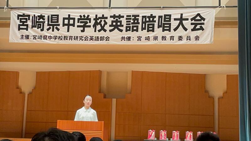令和6年10月7日(月)に、宮崎市民文化ホールで第68回宮崎県中学校英語暗唱大会、第76回宮崎県中学校英語弁論大会が行われました。暗唱大会では、2Aの前迫奏亜さんが「Dinosaurs Before Dark」を堂々と、感情表現豊かに発表しました。中学校図書室に置いている英語小説シリーズの第1巻で、奏亜さんが大好きな物語を自分で選んで表現できました。結果は最優秀賞2位をいただきました。弁論大会では、3Aの柳田桜子さんが、「Shochu is a blue ocean!」を気持ちを込めてしっかりと発表しました。緊張しながらも自分の力を100%発揮できる桜子さん、自信を持って次のステージでも頑張ってほしいです。結果は最優秀賞3位で11月27日(水)から東京で行われる高円宮杯第76回全日本中学校英語弁論大会に参加します。