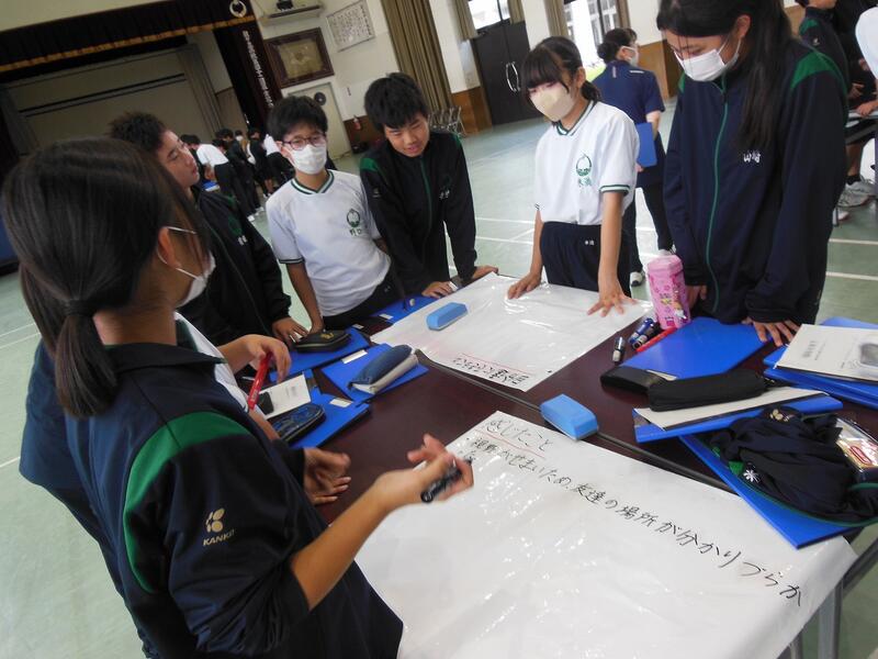 10月末に計画されている「キャリアチャレンジデイOn-Line-Meets」で、自分たちと他校の生徒、そして企業を交えたディスカッションの時に泉ヶ丘附属中生ならではの質問事項を考えました。予定されている4カ所の企業の方々に直接質問できる機会が設けられているので、ぜひ積極的にかかわってほしいものです。こうご期待!