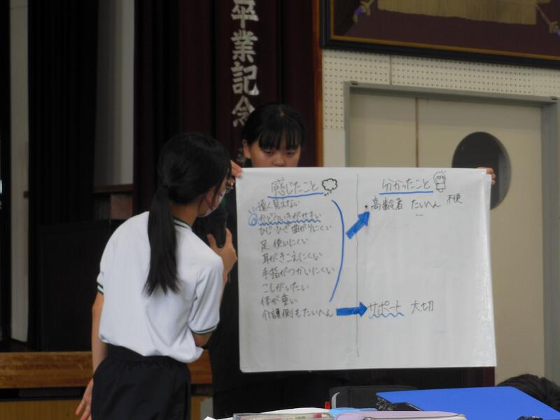 体験後に「感じたこと」「わかったこと」「自分たちにできるこ」をグループごとにまとめ、発表しました。「日常生活で行っていることが難しく感じた」「相手のペースにあわせることが大切」など、10月に高齢者施設を訪問する際にも大切なことに気づくことができました。最後に生徒を代表して吉村颯馬さんがお礼の言葉を述べました。この講座では、多くの道具を運んでいただき、準備もとても大変です。この講座に関わっていただいた全ての方々に感謝申し上げます。ありがとうございました。