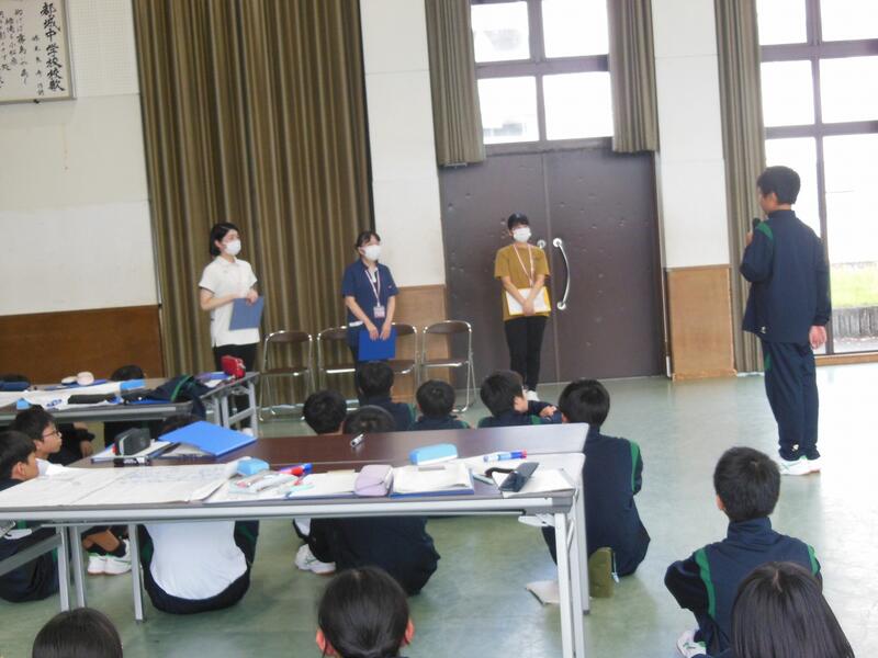 本校で行われている総合的な学習の時間・キャリア探究の中の福祉教育は、主に1年生と3年生で行われています。1年生では高齢者や障がい者について学び、3年生では乳幼児について学びます。3年生は10月23日(水)に「保育園・こども園訪問」が予定されていて、それに向けて3年生では10月2日(水)5・6時間目に「乳幼児との体験活動事前講座」が行われました。講師としておいでくださったのは都城市ボランティアセンター子育ち応援課の海老原直美様、竹松直子様、福吉沙弥香様、椎屋真知子様での4名の保育士の先生方です。おいでになったときに、学習用の道具運びに7名の3年生が協力してくれました。最初に乳幼児の発達段階ごとに遊んでいる様子やできることなどについて話していただき、生徒たちも頷いたり小さい頃を思い出して笑顔になって聴き入っていました。後半は、最初に童歌をみんなで歌ったり動いたりしながら体験しました。みんな楽しそうです。その後、持ってきていただいた乳幼児の遊具などを使って乳幼児の気持ちになって遊んでみました。14歳、15歳の中学3年生ですが、みんな無心に楽しそうに遊んでいました。お話を聴き、体験することで、23日に控えている訪問の心構えもできてきたようです。最後に生徒を代表して石橋彩花さんがお礼の言葉を述べました。お忙しい中、講師を務めてくださった4人の先生方、お世話くださいました都城市ボランティアセンターの皆様に心よりお礼申し上げます。ありがとうございました。