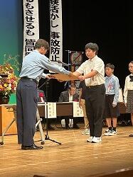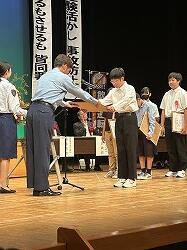 10月12日(土)午後、都城市ウエルネス交流プラザにて「令和6年度 安全・安心みやこんじょ盆地大会」が開かれ、本校2年生の3人が表彰されました。これは夏休みに書いて応募した「令和6年度交通・地域安全作文」の「交通安全の部」で井上結月さんが最優秀賞、平峯楓士さんが優秀賞を、「地域安全の部」で黒木颯斗さんが優秀賞を受賞しての表彰でした。おめでとうございます。大会の冒頭で、一般の部に続き小中学生の部が表彰され、緊張したようですが、堂々と表彰を受けました。交通安全や地域安全について体験したこと、考えたことを率直に述べた作文。地域に広まることで、安心・安全意識の向上の一助となったのではないでしょうか。